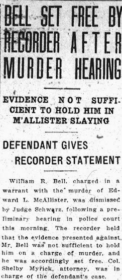 William R. Bell, charged in a warrant with the murder of Edward L. McAllister, was dismissed by Judge Schwarz following a preliminary hearing in police court this morning. The recorder held that the evidence presented against Mr. Bell was not sufficient to hold him on a charge of murder, and he was accordingly set free. Col. Shelby Myrick, attorney, was in charge of the defendant’s case.