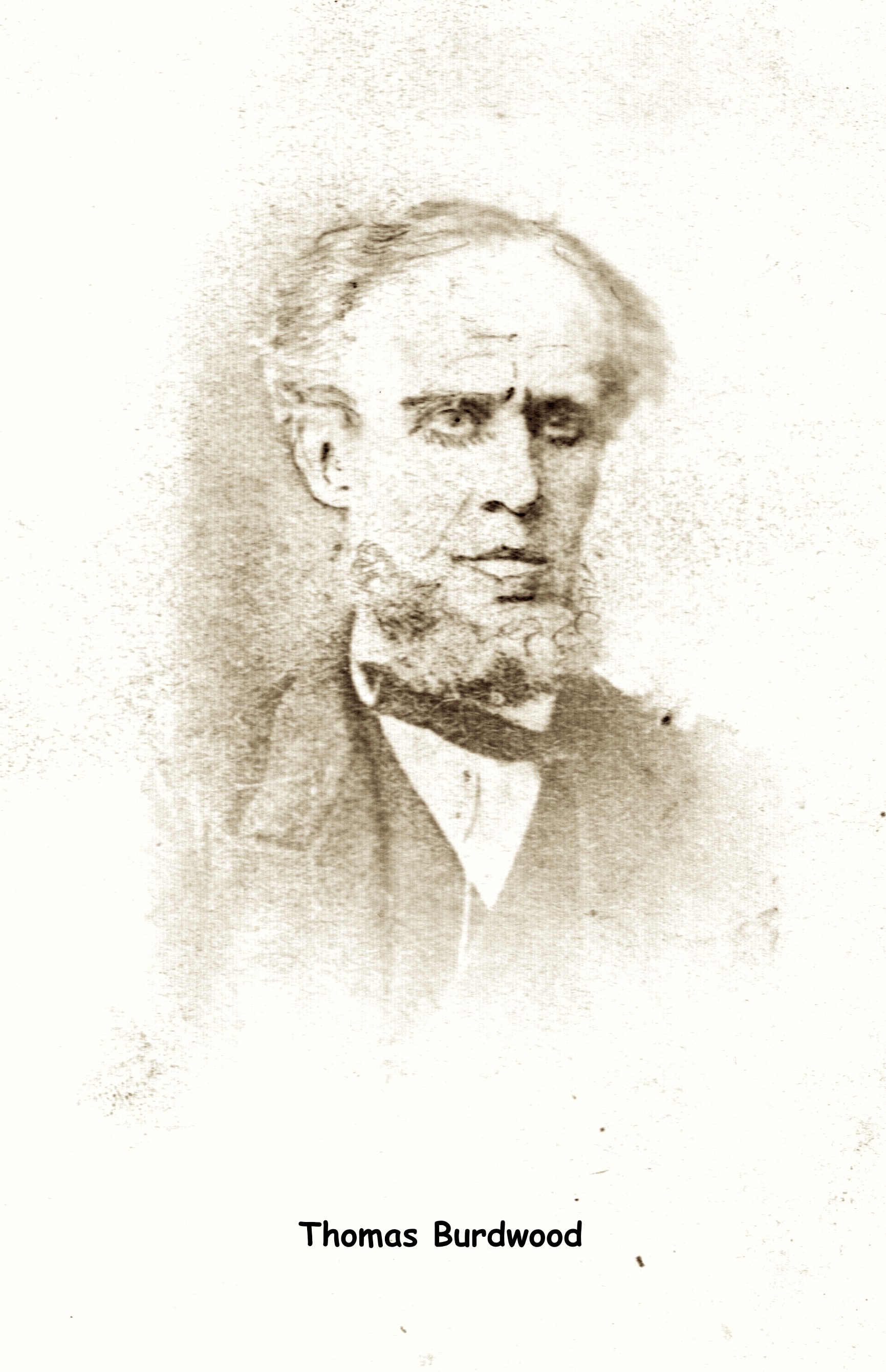 I mentioned earlier about leaving a ½ inch border on the bottom of the photo. That is to add a caption if possible. In the case of a photo of Thomas Burdwood, the original was smallish and had aged pinkish over the years. Once again, I duplicated the photo, cropped it, set color saturation to 0, adjusted the exposure and contrast and sepia level. Once I was done with that, I added text to the image of the individual’s name (based upon what was on the back of the photo) and saved it.